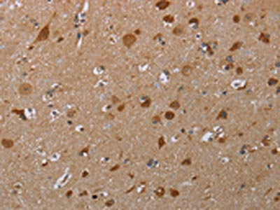 The image on the left is immunohistochemistry of paraffin-embedded Human brain tissue using CSB-PA259165(MARK1 Antibody) at dilution 1/30, on the right is treated with synthetic peptide. (Original magnification: ×200)