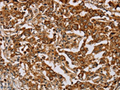 The image on the left is immunohistochemistry of paraffin-embedded Human colon cancer tissue using CSB-PA212278(MB Antibody) at dilution 1/25, on the right is treated with fusion protein. (Original magnification: ×200)