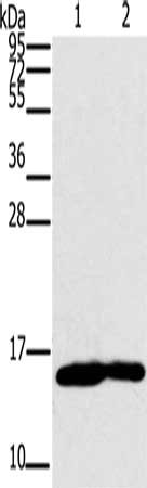 Gel: 10%SDS-PAGE, Lysate: 40 μg, Lane 1-2: Mouse heart tissue, Mouse muscle tissue, Primary antibody: CSB-PA212278(MB Antibody) at dilution 1/350, Secondary antibody: Goat anti rabbit IgG at 1/8000 dilution, Exposure time: 20 seconds