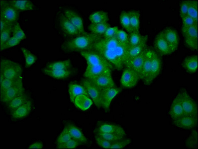 Immunofluorescence staining of HepG2 cells with CSB-PA868322LA01HU at 1:133, counter-stained with DAPI. The cells were fixed in 4% formaldehyde, permeabilized using 0.2% Triton X-100 and blocked in 10% normal Goat Serum. The cells were then incubated with the antibody overnight at 4°C. The secondary antibody was Alexa Fluor 488-congugated AffiniPure Goat Anti-Rabbit IgG(H+L).