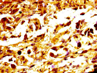 IHC image of CSB-PA013558LA01HU diluted at 1:400 and staining in paraffin-embedded human melanoma performed on a Leica BondTM system. After dewaxing and hydration, antigen retrieval was mediated by high pressure in a citrate buffer (pH 6.0). Section was blocked with 10% normal goat serum 30min at RT. Then primary antibody (1% BSA) was incubated at 4°C overnight. The primary is detected by a biotinylated secondary antibody and visualized using an HRP conjugated SP system.