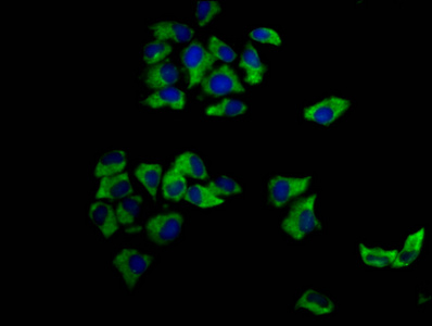 Immunofluorescence staining of Hela cells with CSB-PA013571LA01HU at 1:166, counter-stained with DAPI. The cells were fixed in 4% formaldehyde, permeabilized using 0.2% Triton X-100 and blocked in 10% normal Goat Serum. The cells were then incubated with the antibody overnight at 4°C. The secondary antibody was Alexa Fluor 488-congugated AffiniPure Goat Anti-Rabbit IgG(H+L).