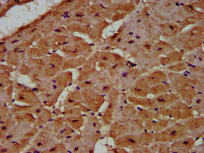 IHC image of CSB-PA013571LA01HU diluted at 1:500 and staining in paraffin-embedded human heart tissue performed on a Leica BondTM system. After dewaxing and hydration, antigen retrieval was mediated by high pressure in a citrate buffer (pH 6.0). Section was blocked with 10% normal goat serum 30min at RT. Then primary antibody (1% BSA) was incubated at 4°C overnight. The primary is detected by a biotinylated secondary antibody and visualized using an HRP conjugated SP system.