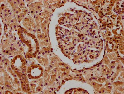 IHC image of CSB-PA013579LA01HU diluted at 1:100 and staining in paraffin-embedded human kidney tissue performed on a Leica BondTM system. After dewaxing and hydration, antigen retrieval was mediated by high pressure in a citrate buffer (pH 6.0). Section was blocked with 10% normal goat serum 30min at RT. Then primary antibody (1% BSA) was incubated at 4°C overnight. The primary is detected by a biotinylated secondary antibody and visualized using an HRP conjugated SP system.