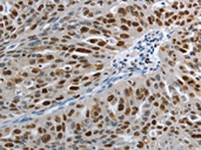 The image on the left is immunohistochemistry of paraffin-embedded Human ovarian cancer tissue using CSB-PA969629(MCM3 Antibody) at dilution 1/30, on the right is treated with fusion protein. (Original magnification: ×200)