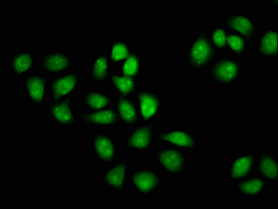 Immunofluorescence staining of Hela cells with CSB-PA013592LA01HU at 1:133, counter-stained with DAPI. The cells were fixed in 4% formaldehyde, permeabilized using 0.2% Triton X-100 and blocked in 10% normal Goat Serum. The cells were then incubated with the antibody overnight at 4°C. The secondary antibody was Alexa Fluor 488-congugated AffiniPure Goat Anti-Rabbit IgG(H+L).