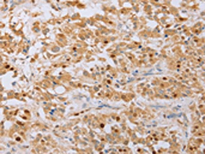 The image on the left is immunohistochemistry of paraffin-embedded Human lung cancer tissue using CSB-PA178630(MCM5 Antibody) at dilution 1/40, on the right is treated with fusion protein. (Original magnification: ×200)