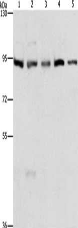 Gel: 6%SDS-PAGE, Lysate: 40 μg, Lane 1-5: HepG2 cells, K562 cells, Jurkat cells, 231 cells, hela cells, Primary antibody: CSB-PA178630(MCM5 Antibody) at dilution 1/300, Secondary antibody: Goat anti rabbit IgG at 1/8000 dilution, Exposure time: 20 seconds