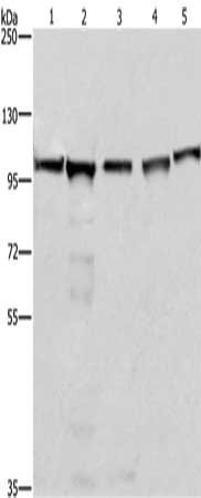 Gel: 10%SDS-PAGE, Lysate: 40 μg, Lane 1-5: 293T cells, A549 cells, Raji cells, K562 cells, NIH/3T3 cells, Primary antibody: CSB-PA178919(MCM6 Antibody) at dilution 1/433.3, Secondary antibody: Goat anti rabbit IgG at 1/8000 dilution, Exposure time: 5 seconds