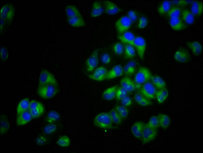 Immunofluorescence staining of Hela cells with CSB-PA738576LA01HU at 1:100, counter-stained with DAPI. The cells were fixed in 4% formaldehyde, permeabilized using 0.2% Triton X-100 and blocked in 10% normal Goat Serum. The cells were then incubated with the antibody overnight at 4°C. The secondary antibody was Alexa Fluor 488-congugated AffiniPure Goat Anti-Rabbit IgG(H+L).