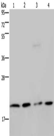 Gel: 10%SDS-PAGE, Lysate: 40 μg, Lane 1-4: Jurkat cells, K562 cells, PC3 cells, A549 cells, Primary antibody: CSB-PA972492(MCTS1 Antibody) at dilution 1/200, Secondary antibody: Goat anti rabbit IgG at 1/8000 dilution, Exposure time: 3 minutes