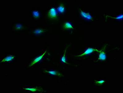 Immunofluorescence staining of U251 cells with CSB-PA013621EA01HU at 1:133, counter-stained with DAPI. The cells were fixed in 4% formaldehyde, permeabilized using 0.2% Triton X-100 and blocked in 10% normal Goat Serum. The cells were then incubated with the antibody overnight at 4°C. The secondary antibody was Alexa Fluor 488-congugated AffiniPure Goat Anti-Rabbit IgG(H+L).