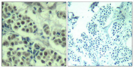 Immunohistochemical analysis of paraffin-embedded human breast carcinoma tissue using MDM2(Ab-166) Antibody(left) or the same antibody preincubated with blocking peptide(right).