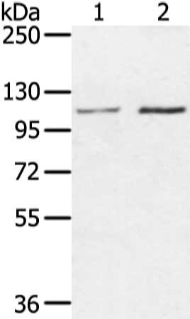 Gel: 6%SDS-PAGE, Lysate: 40 μg, Lane 1-2: Hepg2 and hela cell, Primary antibody: CSB-PA909624(MED16 Antibody) at dilution 1/400 dilution, Secondary antibody: Goat anti rabbit IgG at 1/8000 dilution, Exposure time: 20 seconds