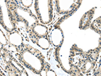 The image on the left is immunohistochemistry of paraffin-embedded Human thyroid cancer tissue using CSB-PA995695(MED18 Antibody) at dilution 1/30, on the right is treated with fusion protein. (Original magnification: ×200)