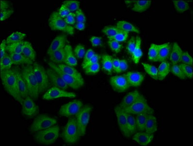 Immunofluorescence staining of HepG2 cells with CSB-PA773606LA01HU at 1:66, counter-stained with DAPI. The cells were fixed in 4% formaldehyde, permeabilized using 0.2% Triton X-100 and blocked in 10% normal Goat Serum. The cells were then incubated with the antibody overnight at 4°C. The secondary antibody was Alexa Fluor 488-congugated AffiniPure Goat Anti-Rabbit IgG(H+L).
