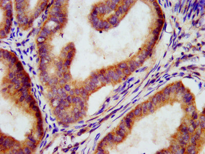 IHC image of CSB-PA872434LA01HU diluted at 1:300 and staining in paraffin-embedded human endometrial cancer performed on a Leica BondTM system. After dewaxing and hydration, antigen retrieval was mediated by high pressure in a citrate buffer (pH 6.0). Section was blocked with 10% normal goat serum 30min at RT. Then primary antibody (1% BSA) was incubated at 4°C overnight. The primary is detected by a biotinylated secondary antibody and visualized using an HRP conjugated SP system.