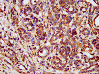 IHC image of CSB-PA013715LA01HU diluted at 1:400 and staining in paraffin-embedded human pancreatic cancer performed on a Leica BondTM system. After dewaxing and hydration, antigen retrieval was mediated by high pressure in a citrate buffer (pH 6.0). Section was blocked with 10% normal goat serum 30min at RT. Then primary antibody (1% BSA) was incubated at 4°C overnight. The primary is detected by a biotinylated secondary antibody and visualized using an HRP conjugated SP system.