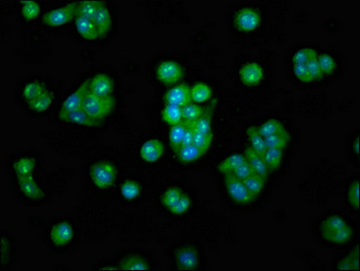 Immunofluorescence staining of HepG2 cells with CSB-PA013716LA01HU at 1:100, counter-stained with DAPI. The cells were fixed in 4% formaldehyde, permeabilized using 0.2% Triton X-100 and blocked in 10% normal Goat Serum. The cells were then incubated with the antibody overnight at 4°C. The secondary antibody was Alexa Fluor 488-congugated AffiniPure Goat Anti-Rabbit IgG(H+L).