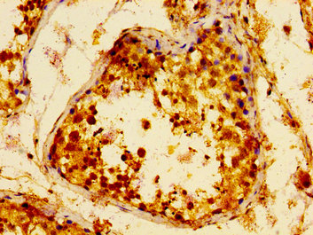 IHC image of CSB-PA013716LA01HU diluted at 1:100 and staining in paraffin-embedded human testis tissue performed on a Leica BondTM system. After dewaxing and hydration, antigen retrieval was mediated by high pressure in a citrate buffer (pH 6.0). Section was blocked with 10% normal goat serum 30min at RT. Then primary antibody (1% BSA) was incubated at 4°C overnight. The primary is detected by a biotinylated secondary antibody and visualized using an HRP conjugated SP system.