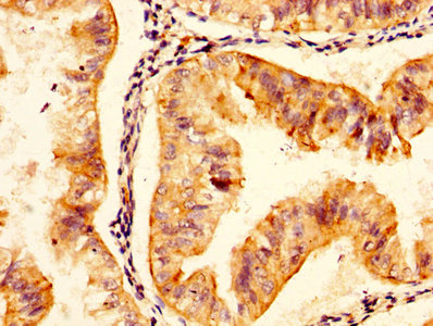 IHC image of CSB-PA623799LA01HU diluted at 1:300 and staining in paraffin-embedded human endometrial cancer performed on a Leica BondTM system. After dewaxing and hydration, antigen retrieval was mediated by high pressure in a citrate buffer (pH 6.0). Section was blocked with 10% normal goat serum 30min at RT. Then primary antibody (1% BSA) was incubated at 4°C overnight. The primary is detected by a biotinylated secondary antibody and visualized using an HRP conjugated SP system.