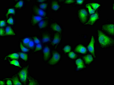 Immunofluorescence staining of Hela cells with CSB-PA851555LA01HU at 1:100, counter-stained with DAPI. The cells were fixed in 4% formaldehyde, permeabilized using 0.2% Triton X-100 and blocked in 10% normal Goat Serum. The cells were then incubated with the antibody overnight at 4°C. The secondary antibody was Alexa Fluor 488-congugated AffiniPure Goat Anti-Rabbit IgG(H+L).