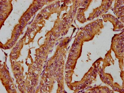 IHC image of CSB-PA851555LA01HU diluted at 1:200 and staining in paraffin-embedded human endometrial cancer performed on a Leica BondTM system. After dewaxing and hydration, antigen retrieval was mediated by high pressure in a citrate buffer (pH 6.0). Section was blocked with 10% normal goat serum 30min at RT. Then primary antibody (1% BSA) was incubated at 4°C overnight. The primary is detected by a biotinylated secondary antibody and visualized using an HRP conjugated SP system.