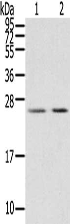 Gel: 12%SDS-PAGE, Lysate: 40 μg, Lane 1-2: Human breast infiltrative duct tissue, Human placenta tissue, Primary antibody: CSB-PA799324(MIG7 Antibody) at dilution 1/200, Secondary antibody: Goat anti rabbit IgG at 1/8000 dilution, Exposure time: 15 seconds