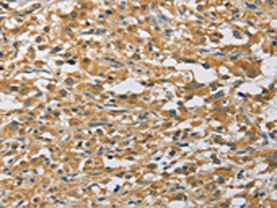 The image on the left is immunohistochemistry of paraffin-embedded Human thyroid cancer tissue using CSB-PA167583(MIP Antibody) at dilution 1/60, on the right is treated with fusion protein. (Original magnification: ×200)