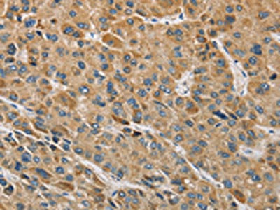 The image on the left is immunohistochemistry of paraffin-embedded Human liver cancer tissue using CSB-PA167583(MIP Antibody) at dilution 1/60, on the right is treated with fusion protein. (Original magnification: ×200)
