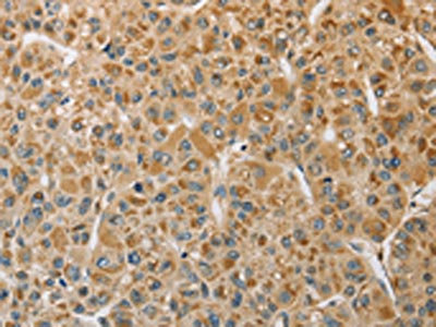 The image on the left is immunohistochemistry of paraffin-embedded Human liver cancer tissue using CSB-PA283369(MIP Antibody) at dilution 1/50, on the right is treated with fusion protein. (Original magnification: ×200)