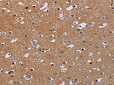 The image on the left is immunohistochemistry of paraffin-embedded Human brain tissue using CSB-PA569334(MKKS Antibody) at dilution 1/50, on the right is treated with fusion protein. (Original magnification: ×200)