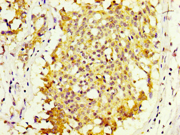 IHC image of CSB-PA883390LA01HU diluted at 1:600 and staining in paraffin-embedded human breast cancer performed on a Leica BondTM system. After dewaxing and hydration, antigen retrieval was mediated by high pressure in a citrate buffer (pH 6.0). Section was blocked with 10% normal goat serum 30min at RT. Then primary antibody (1% BSA) was incubated at 4°C overnight. The primary is detected by a biotinylated secondary antibody and visualized using an HRP conjugated SP system.