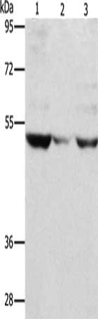 Gel: 12%SDS-PAGE, Lysate: 80 μg, Lane 1-3: PC3 cells, mouse muscle tissue, A375 cells, Primary antibody: CSB-PA563995(MMP1 Antibody) at dilution 1/500, Secondary antibody: Goat anti rabbit IgG at 1/8000 dilution, Exposure time: 1 minute