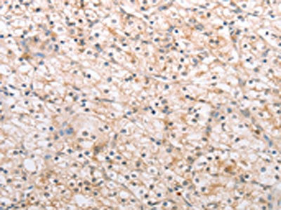 The image on the left is immunohistochemistry of paraffin-embedded Human renal cancer tissue using CSB-PA029613(MMP11 Antibody) at dilution 1/40, on the right is treated with synthetic peptide. (Original magnification: ×200)