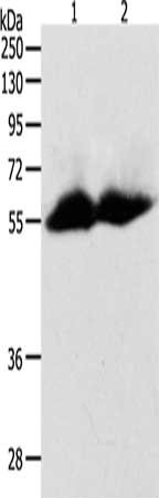 Gel: 10%SDS-PAGE, Lysate: 60 μg, Lane 1-2: Human colon tissue, Human ovarian cancer tissue, Primary antibody: CSB-PA029613(MMP11 Antibody) at dilution 1/600, Secondary antibody: Goat anti rabbit IgG at 1/8000 dilution, Exposure time: 1 minute