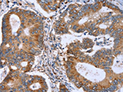 The image on the left is immunohistochemistry of paraffin-embedded Human colon cancer tissue using CSB-PA563134(MMP9 Antibody) at dilution 1/30, on the right is treated with synthetic peptide. (Original magnification: ×200)