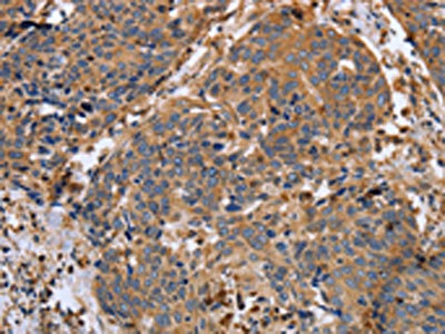The image on the left is immunohistochemistry of paraffin-embedded Human cervical cancer tissue using CSB-PA151401(MMP9 Antibody) at dilution 1/20, on the right is treated with synthetic peptide. (Original magnification: ×200)