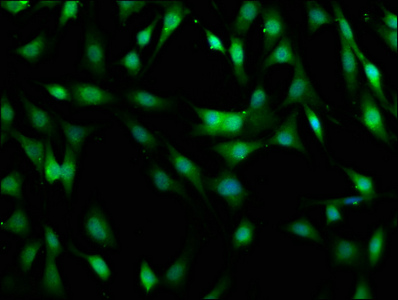 Immunofluorescence staining of Hela cells with CSB-PA762574HA01HU at 1:400, counter-stained with DAPI. The cells were fixed in 4% formaldehyde, permeabilized using 0.2% Triton X-100 and blocked in 10% normal Goat Serum. The cells were then incubated with the antibody overnight at 4°C. The secondary antibody was Alexa Fluor 488-congugated AffiniPure Goat Anti-Rabbit IgG(H+L).