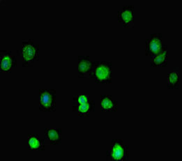 Immunofluorescent analysis of HepG2 cells using CSB-PA803127LA01HU at dilution of 1:100 and Alexa Fluor 488-congugated AffiniPure Goat Anti-Rabbit IgG(H+L)