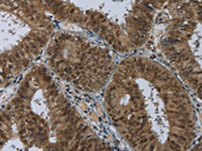 The image on the left is immunohistochemistry of paraffin-embedded Human colon cancer tissue using CSB-PA056873(MRE11A Antibody) at dilution 1/60, on the right is treated with fusion protein. (Original magnification: ×200)