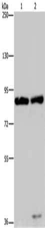 Gel: 6%SDS-PAGE, Lysate: 40 μg, Lane 1-2: Raji cells, K562 cells, Primary antibody: CSB-PA056873(MRE11A Antibody) at dilution 1/500, Secondary antibody: Goat anti rabbit IgG at 1/8000 dilution, Exposure time: 10 minutes