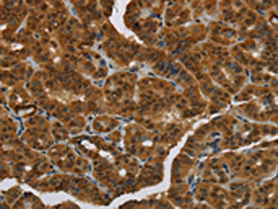 The image on the left is immunohistochemistry of paraffin-embedded Human thyroid cancer tissue using CSB-PA926920(MRE11A Antibody) at dilution 1/60, on the right is treated with fusion protein. (Original magnification: ×200)
