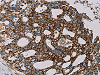 The image on the left is immunohistochemistry of paraffin-embedded Human thyroid cancer tissue using CSB-PA259631(MRPL12 Antibody) at dilution 1/20, on the right is treated with fusion protein. (Original magnification: ×200)