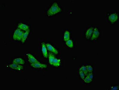 Immunofluorescent analysis of HepG2 cells using CSB-PA621647ESR1HU at dilution of 1:100 and Alexa Fluor 488-congugated AffiniPure Goat Anti-Rabbit IgG(H+L)