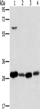 Gel: 8%SDS-PAGE, Lysate: 40 μg, Lane 1-4: 293T cells, human testis tissue, A375 cells, human normal kidney tissue, Primary antibody: CSB-PA062043(MRPL28 Antibody) at dilution 1/600, Secondary antibody: Goat anti rabbit IgG at 1/8000 dilution, Exposure time: 2 seconds