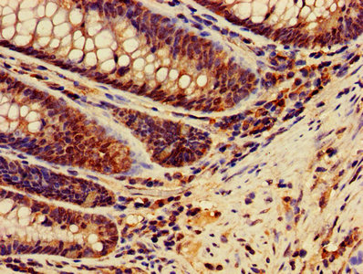 IHC image of CSB-PA16889A0Rb diluted at 1:400 and staining in paraffin-embedded human colon cancer performed on a Leica BondTM system. After dewaxing and hydration, antigen retrieval was mediated by high pressure in a citrate buffer (pH 6.0). Section was blocked with 10% normal goat serum 30min at RT. Then primary antibody (1% BSA) was incubated at 4°C overnight. The primary is detected by a biotinylated secondary antibody and visualized using an HRP conjugated SP system.