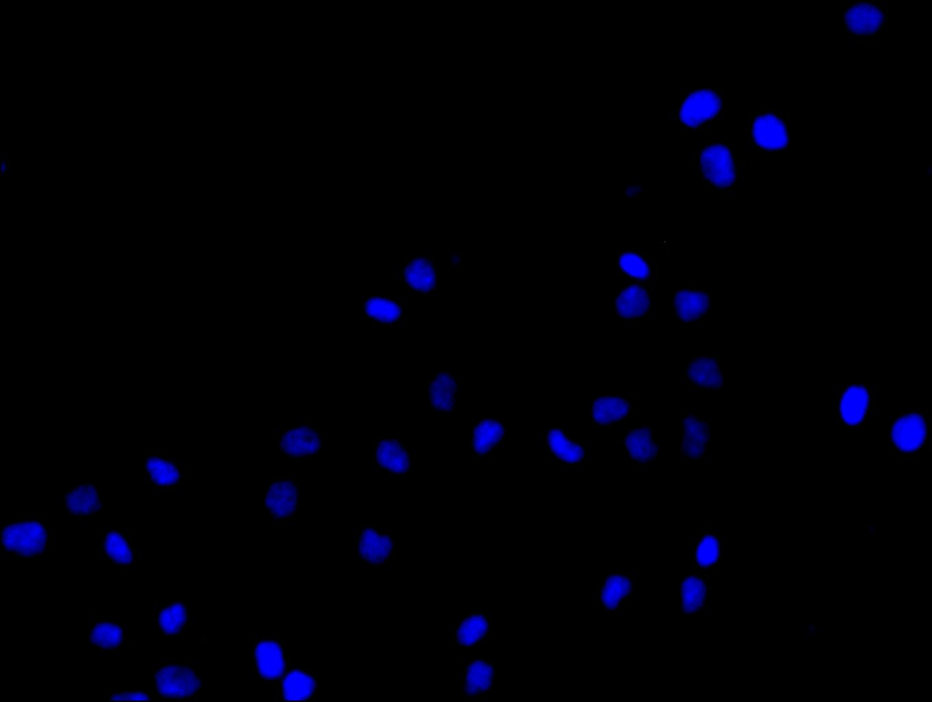 Immunofluorescence staining of Hela cell with 5% goat serum, counter-stained with DAPI. The cells were fixed in 4% formaldehyde and blocked in 10% normal Goat Serum. The cells were then incubated with the antibody overnight at 4C. The secondary antibody was Alexa Fluor 488-congugated AffiniPure Goat Anti-Rabbit IgG(H+L).