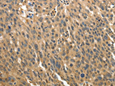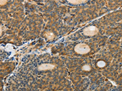 The image on the left is immunohistochemistry of paraffin-embedded Human thyroid cancer tissue using CSB-PA063025(MSN Antibody) at dilution 1/30, on the right is treated with fusion protein. (Original magnification: ×200)