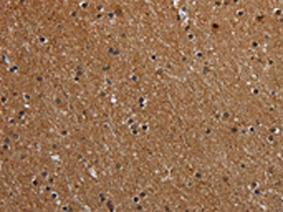 The image on the left is immunohistochemistry of paraffin-embedded Human brain tissue using CSB-PA149107(MT-ND1 Antibody) at dilution 1/50, on the right is treated with synthetic peptide. (Original magnification: ×200)